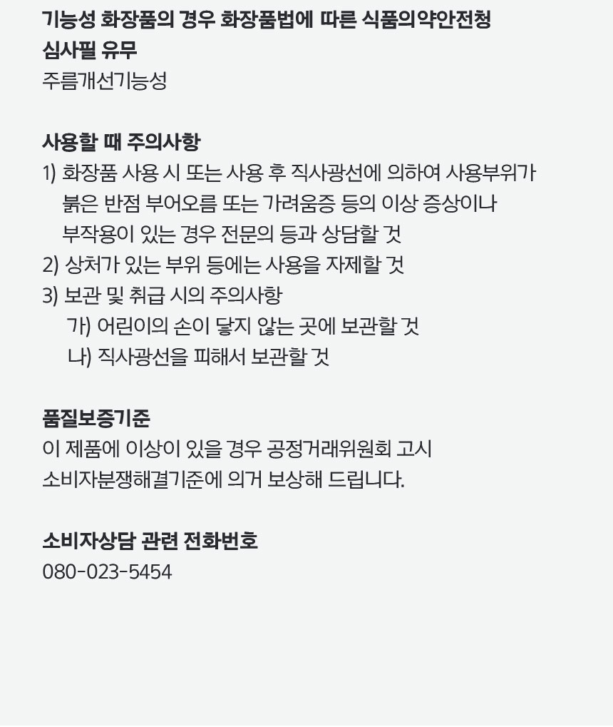 1) 화장품 사용 시 또는 사용 후 직사광선에 의하여 사용부위가 붉은 반점 부어오름 또는 가려움증 등의 이상 증상이나 부작용이 있는 경우 전문의 등과 상담할 것