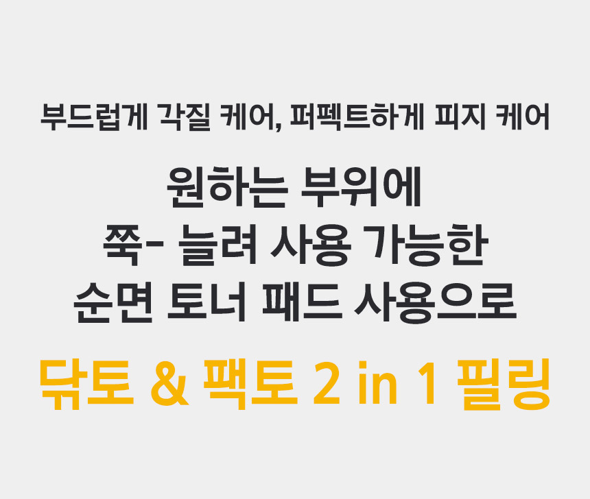 부드럽게 각질 케어, 퍼펙트하게 피지 케어 원하는 부위에 쭉- 늘려 사용 가능한 순면 토너 패드 사용으로 닦토 & 팩토 2 in 1 필링