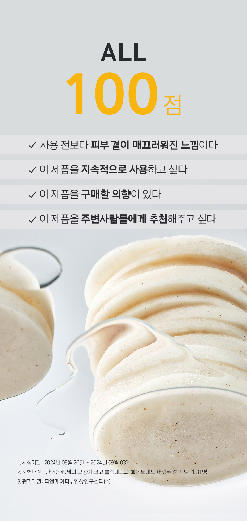 - 2. 시험대상: 만 20~49세의 모공이 크고 블랙헤드와 화이트헤드가 있는 성인 남녀, 31명
