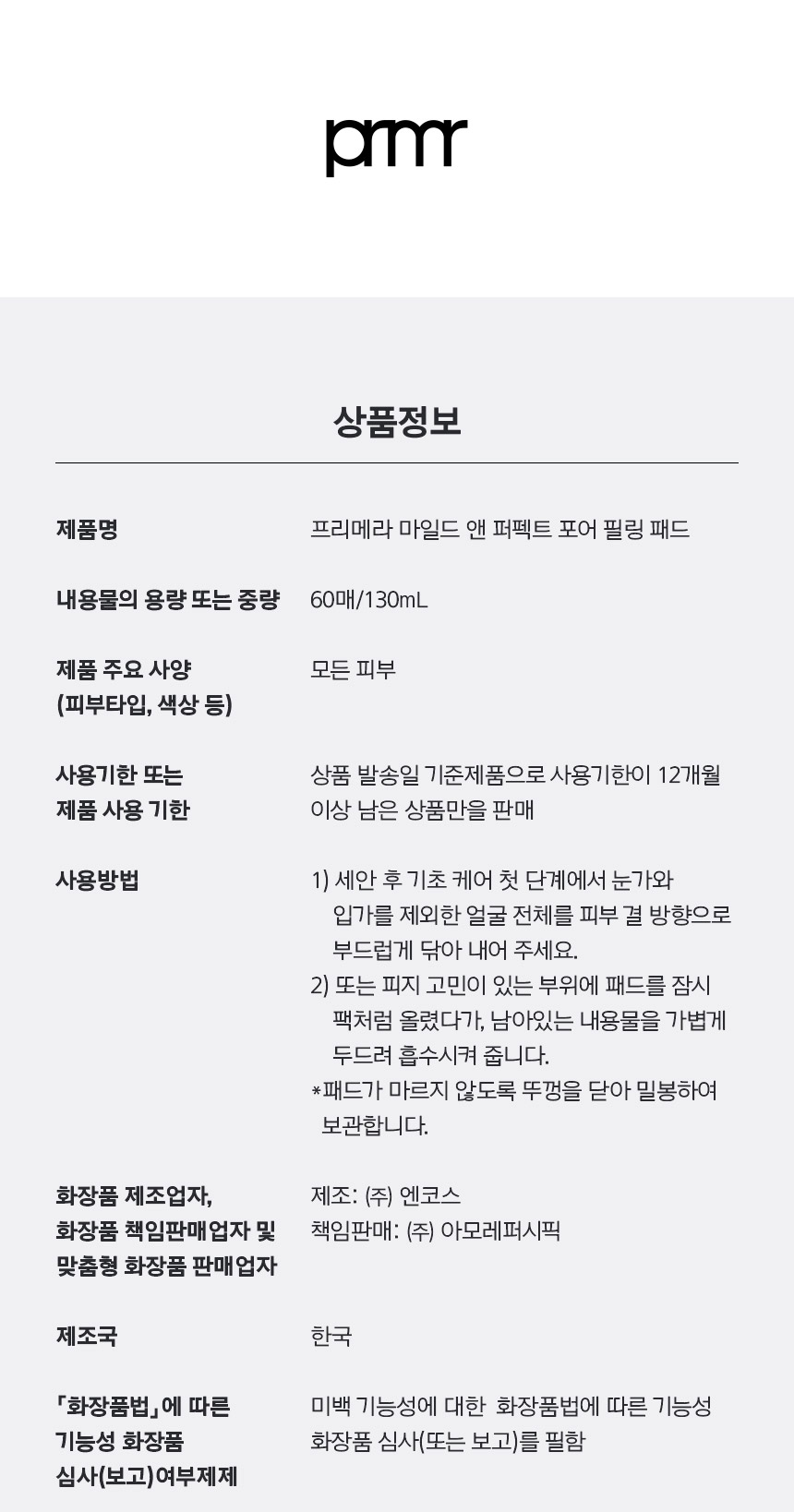- 제품명 프리메라 마일드 앤 퍼펙트 포어 필링 패드