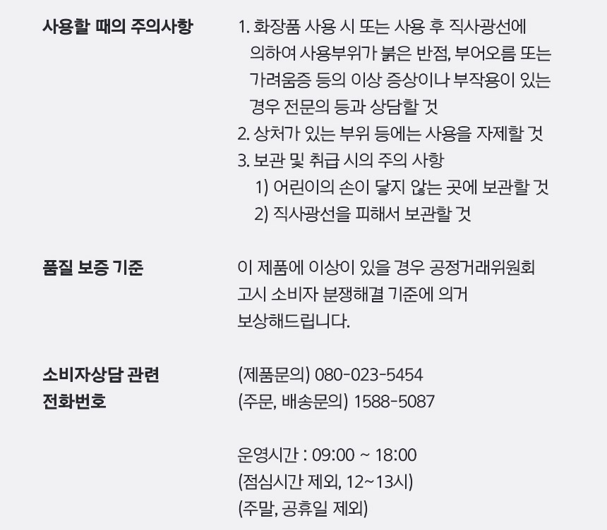 - 화장품 사용 시 또는 사용 후 직사광선에 의하여 사용부위가 붉은 반점, 부어오름 또는 가려움증 등의 이상 증상이나 부작용이 있는 경우 전문의 등과 상담할 것
