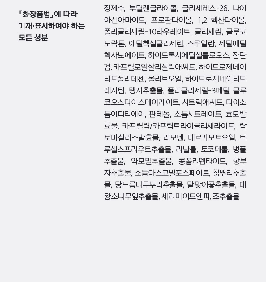 - 「화장품법」에 따라 기재·표시하여야 하는 모든 성분 정제수, 부틸렌글라이콜, 글리세레스-26, 나이아신아마이드, 프로판다이올, 1,2-헥산다이올, 폴리글리세릴-10라우레이트, 글리세린, 글루코노락톤, 에틸헥실글리세린, 스쿠알란, 세틸에틸헥사노에이트, 하이드록시에틸셀룰로오스, 잔탄검, 카프릴로일살리실릭애씨드, 하이드로제네이티드폴리데센, 올리브오일, 하이드로제네이티드레시틴, 탱자추출물, 폴리글리세릴-3메틸 글루코오스다이스테아레이트, 시트릭애씨드, 다이소듐이디티에이, 판테놀, 소듐시트레이트, 효모발효물, 카프릴릭/카프릭트라이글리세라이드, 락토바실러스발효물, 리모넨, 베르가모트오일, 브루셀스프라우트추출물, 리날룰, 토코페롤, 병풀추출물, 약모밀추출물, 콩폴리펩타이드, 향부자추출물, 소듐아스코빌포스페이트, 칡뿌리추출물, 당느릅나무뿌리추출물, 달맞이꽃추출물, 대왕소나무잎추출물, 세라마이드엔피, 조추출물