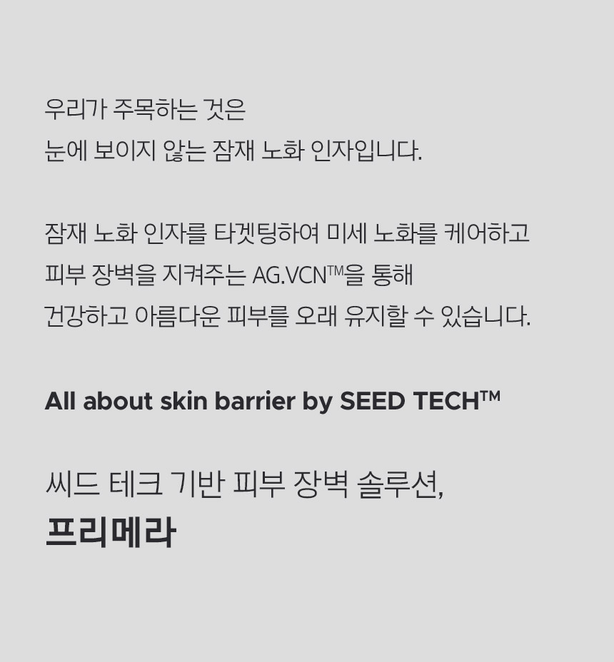 우리가 주목하는 것은 눈에 보이지 않는 잠재 노화 인자입니다. 잠재 노화 인자를 타겟팅하여 미세 노화를 케어하고 피부 장벽을 지켜주는 AG.VCNTM을 통해 건강하고 아름다운 피부를 오래 유지할 수 있습니다. All about skin barrier by SEED TECHTM씨드 테크 기반 피부 장벽 솔루션, 프리메라